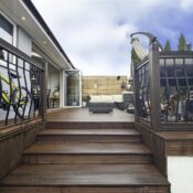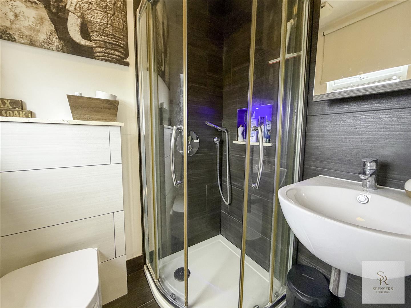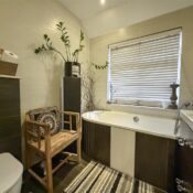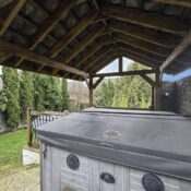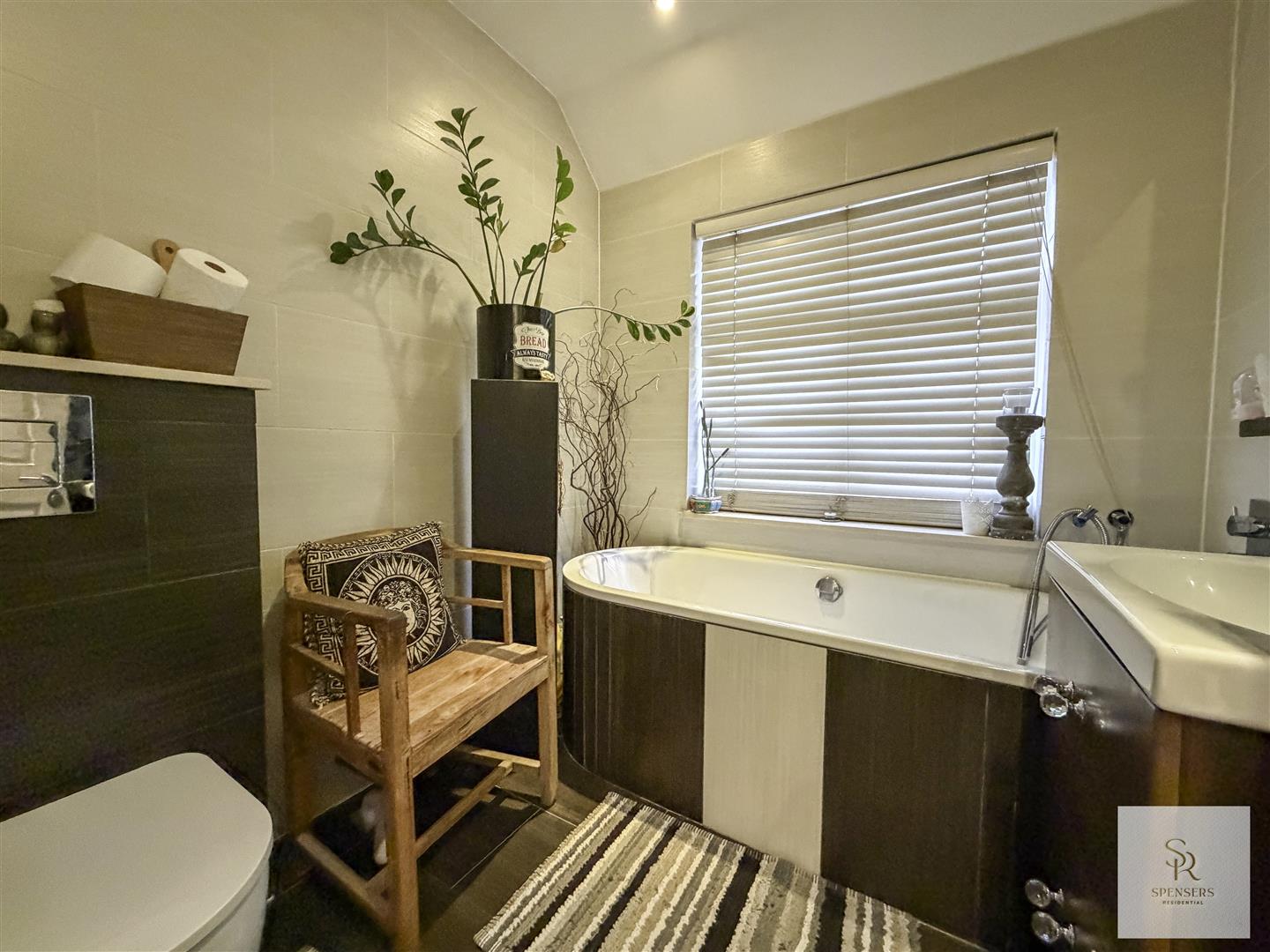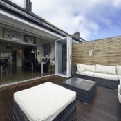 The rear garden is a standout, offering a stylish decked terrace ideal for alfresco dining, a neat lawned area, and a luxury hot tub/jacuzzi with ambient lighting and Bluetooth speakers, creating an exceptional setting for both relaxation and entertaining.