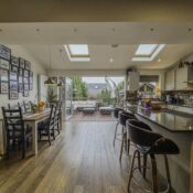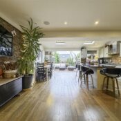 Behind its attractive frontage, complete with private driveway parking and a garage, the property opens into a welcoming hallway with a contemporary downstairs WC. The heart of the home is the spectacular open-plan kitchen/dining space, a beautifully designed area featuring an island, high-end integrated appliances, skylights, and premium bi-folding doors that seamlessly blend indoor and outdoor living. A separate utility room adds further convenience, while the elegant living room with a feature bay window provides a calm and comfortable retreat.