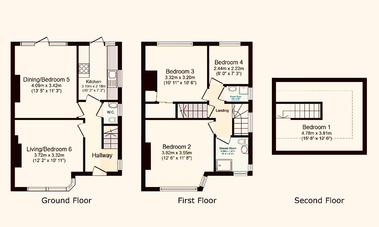 The ground floor comprises a fitted kitchen, two additional rooms that can serve as bedrooms or reception spaces, and a convenient downstairs cloakroom. On the first floor, there are three bedrooms and two shower rooms, while the second floor provides an additional spacious bedroom.