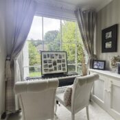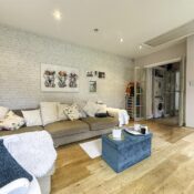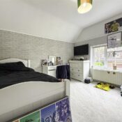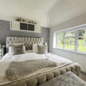 Upstairs, a spacious landing leads to three beautifully proportioned bedrooms and a modern family bathroom. The principal suite enjoys fitted wardrobes, dual-aspect views, and a bespoke vanity unit, while the second bedroom also features ample storage. The third bedroom, enhanced by a striking corner window, offers further flexibility as a guest room, nursery, or home office.